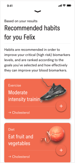 The Lyon Health Coach 360 app is the companion app for Lykon.de. With it, users can fill out a questionnaire to assess their lifestyle and synchronize the results of their purchased blood tests. Based on those results users receive habit recommendations to improve biomarkers with critical results. Through the app those new habits can be started and tracked, enabling people to live a healthier life and improve their blood result biomarker scores.